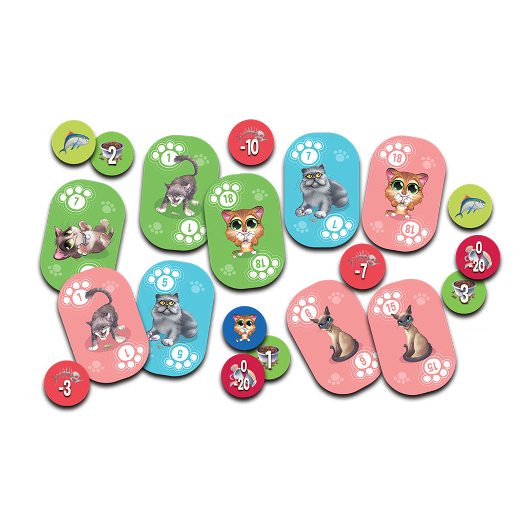 Each game is divided into three rounds, and each round is divided into nine turns. On a turn, each player plays one cat card, then the player who played the most valuable card wins one award token. Keep in mind that not all awards are positive! At the end of the game, the player who collected the most points wins.