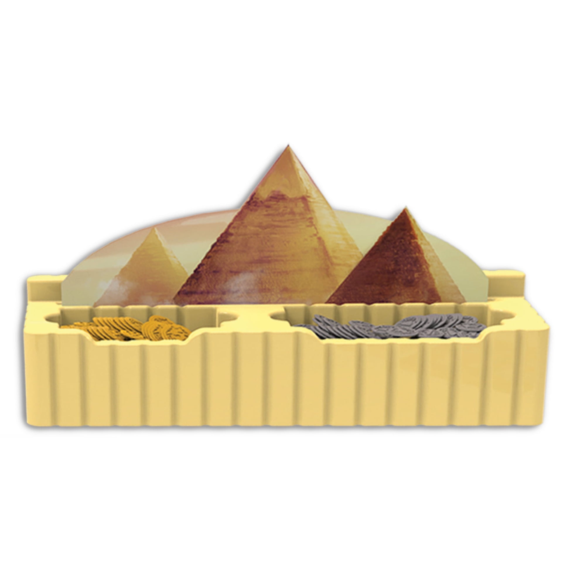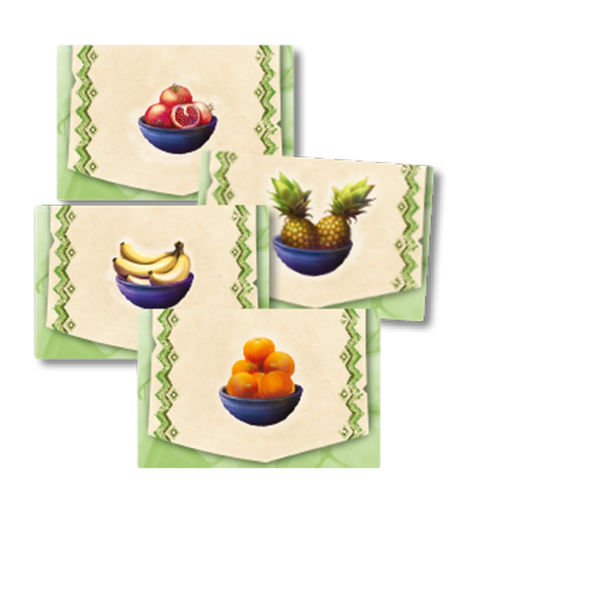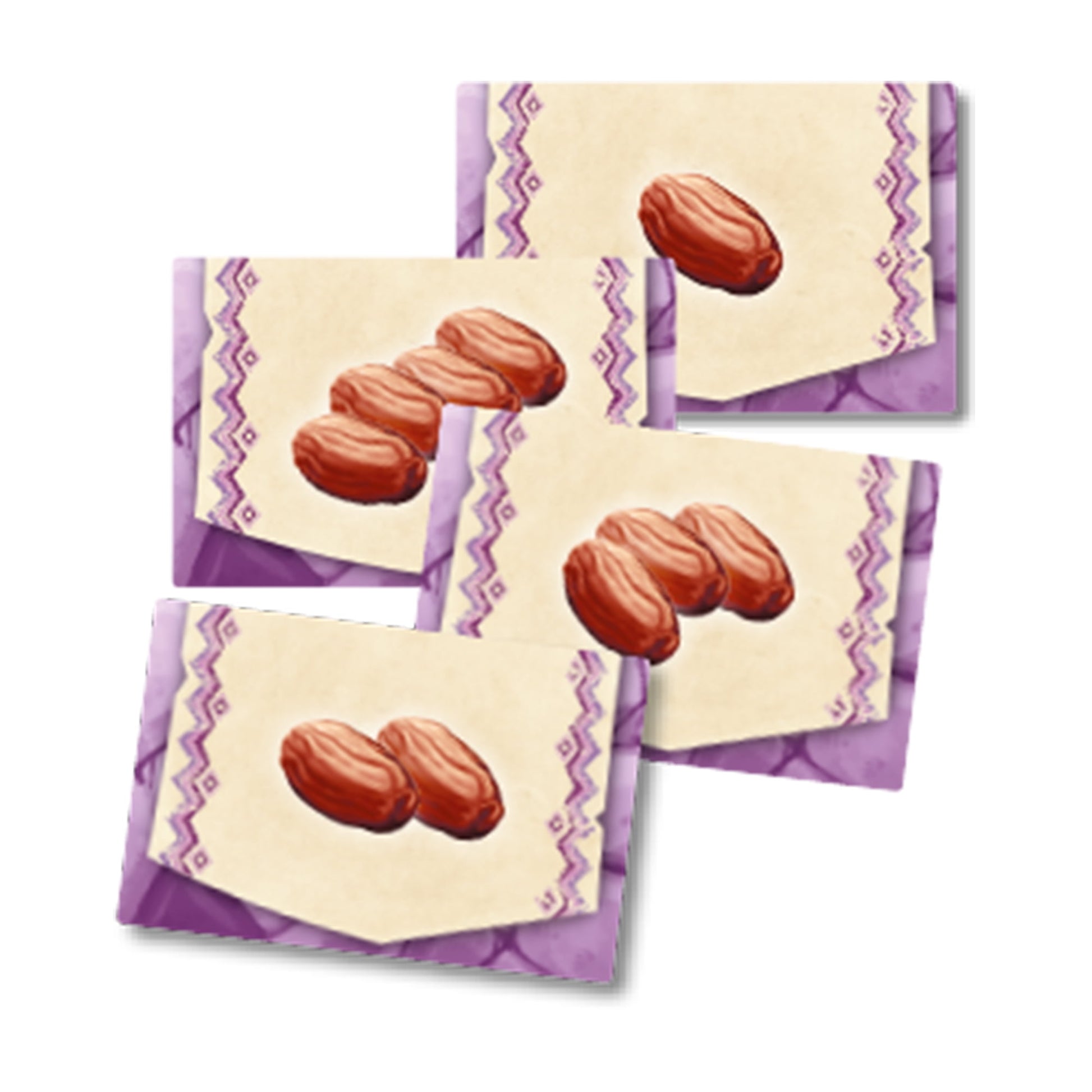 - STRATEGY GAME: Each player has their own caravan of four camels that can carry 3, 4, 5, and 6 goods. Goods are available in markets and come in four types - carpets, vases, dates, and (non-date) fruit. Each double-sided market indicates how many face-up and face-down cards are placed there, in addition to the special power of that market.
