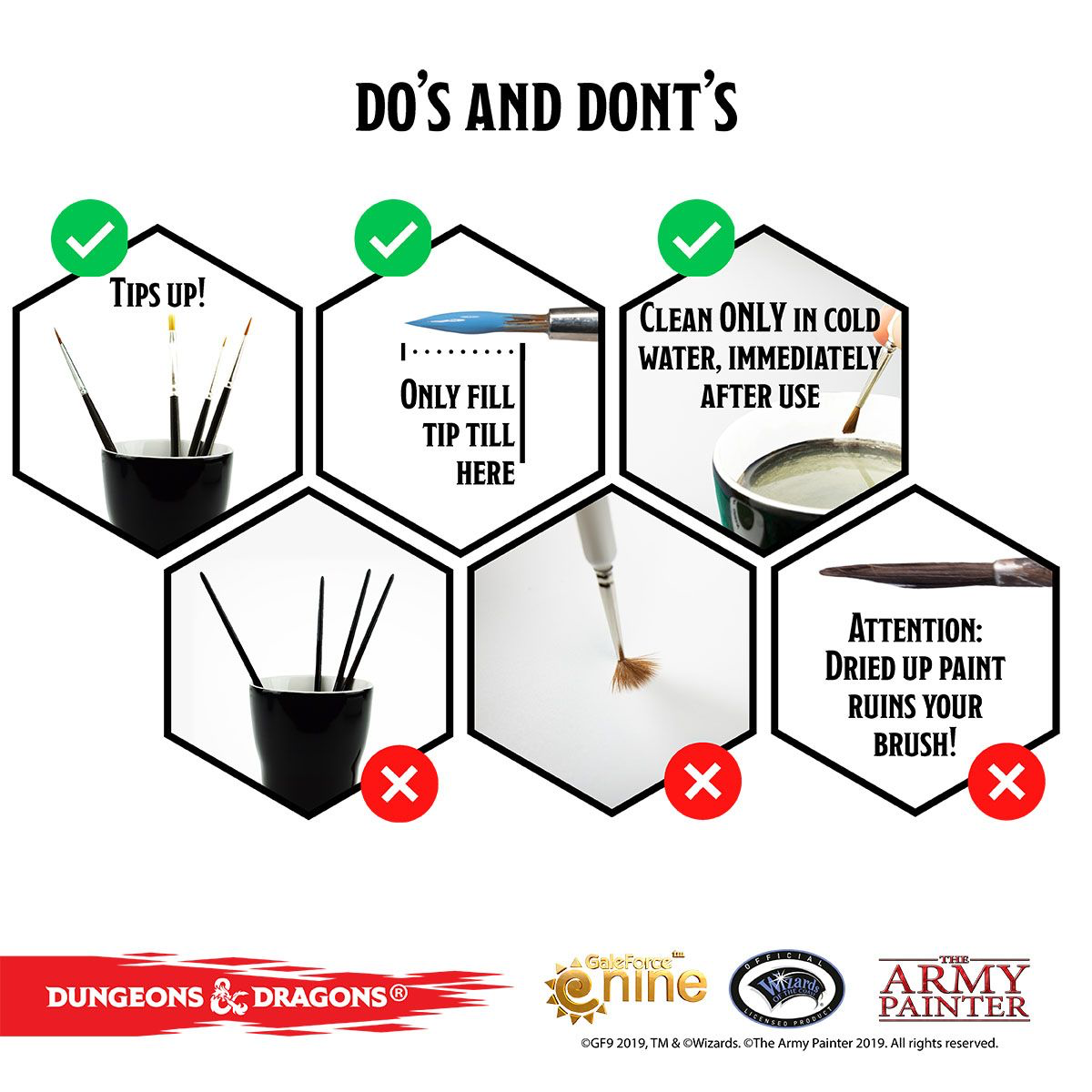The Dungeons & Dragons Brush Set includes three superior brushes - all complimenting the Starter Brush from the Adventurers set, for a full palette of brushes. This selection of German-made quality brushes adds a large Basecoat brush for bigger monsters, a fine Precise Detail brush for the smaller parts of the miniatures, and the special Drybrush for quick and effective highlights. The Army Painter would like to remind our customer base that selling on Amazon or other 3rd party online platforms is against the company policy of The Army Painter.