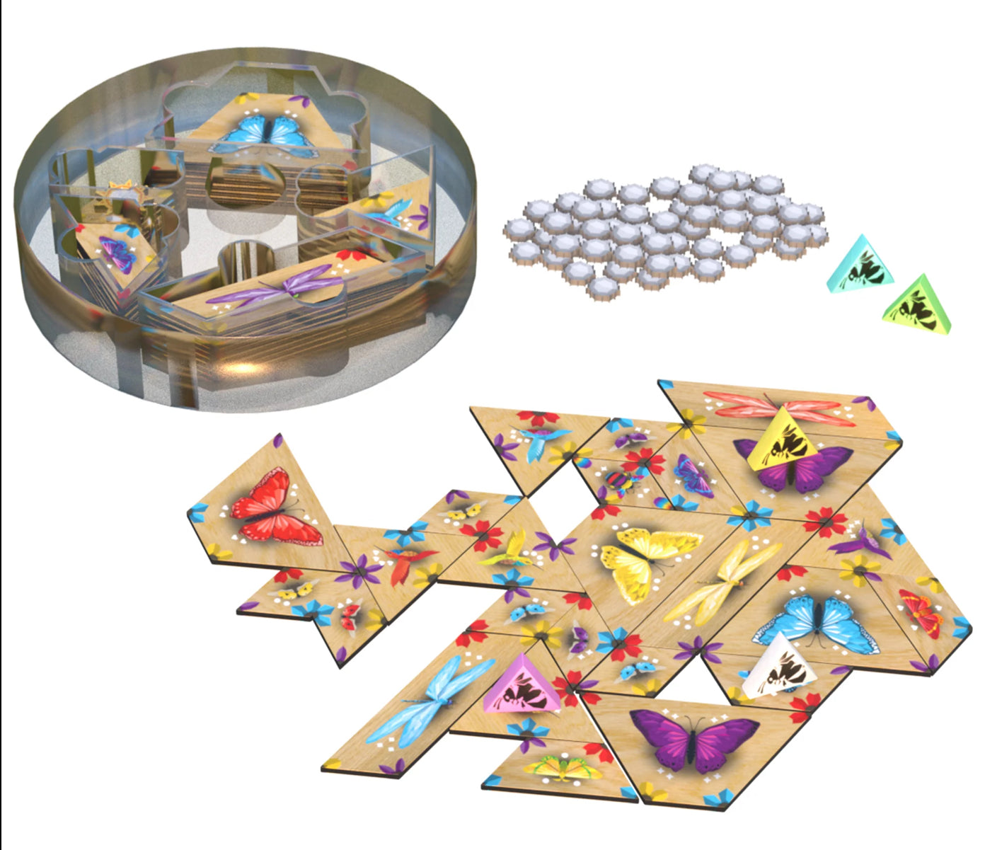 Flutter is a strategic tile-laying strategy game for 2 to 5 players, ages 8 and up, and it takes about 30 minutes to play. Players take turns laying tiles of varying shapes, earning petal tokens for matching flower petals in each corner. As the game progresses, players will spend those petal tokens when they enclose a previously laid tile, supplying the tile’s pollinator with all the flowers it needs, earning pollen. Once a single stack of tiles in the supply rondel has been emptied, the player with most pollen is the winner!
