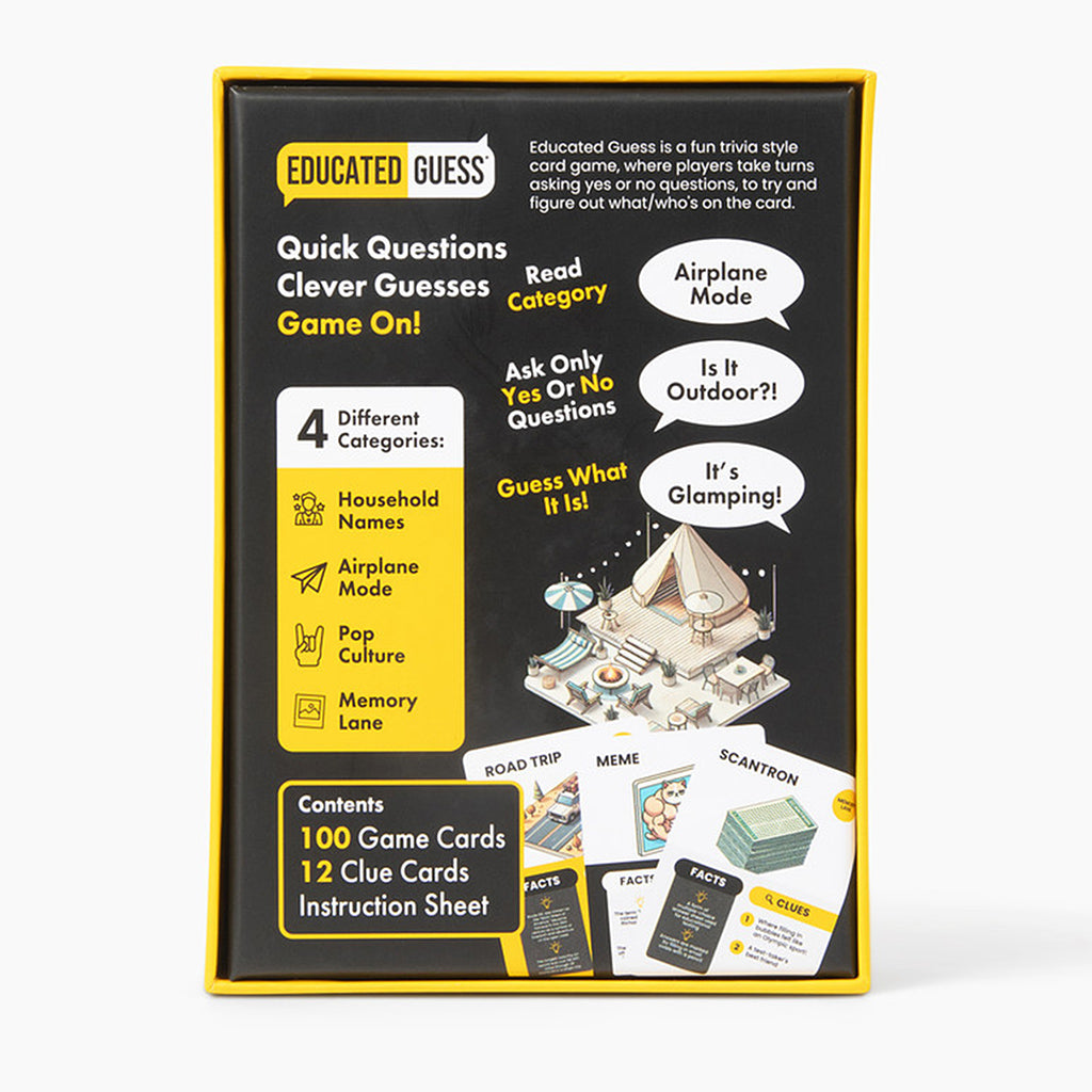 - PLAY ANYWHERE: The perfect game to bring to bring on trips, adventures, or friends houses. Wether you're on a road trip, plane, train, or boat, Educated Guess is scientifically engineered to make it better.
