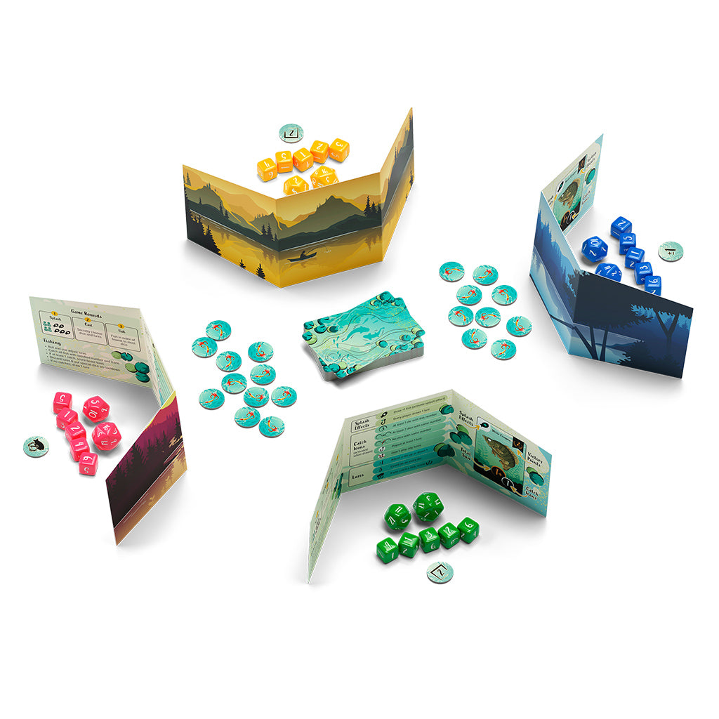 Players compete to collect the most points by reeling in fish cards. To catch a fish, players roll their dice to beat the fish's target number, as well as meet any specific requirements on the card. Whoever completes those requirements and is closest to the target catches the fish!