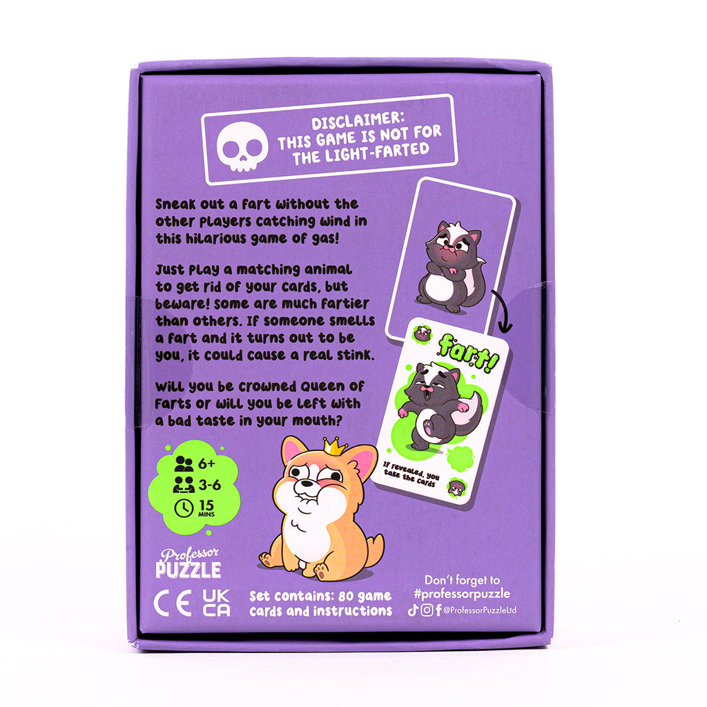 Sneak out a fart without the other players catching wind in this hilarious game of gas! Just play a matching animal to get rid of your cards, but beware! Some are much fartier than others. If someone smells a fart and it turns out to be you, it could cause a real stink. Will you be crowned Queen of Farts or will you be left with a bad taste in your mouth?