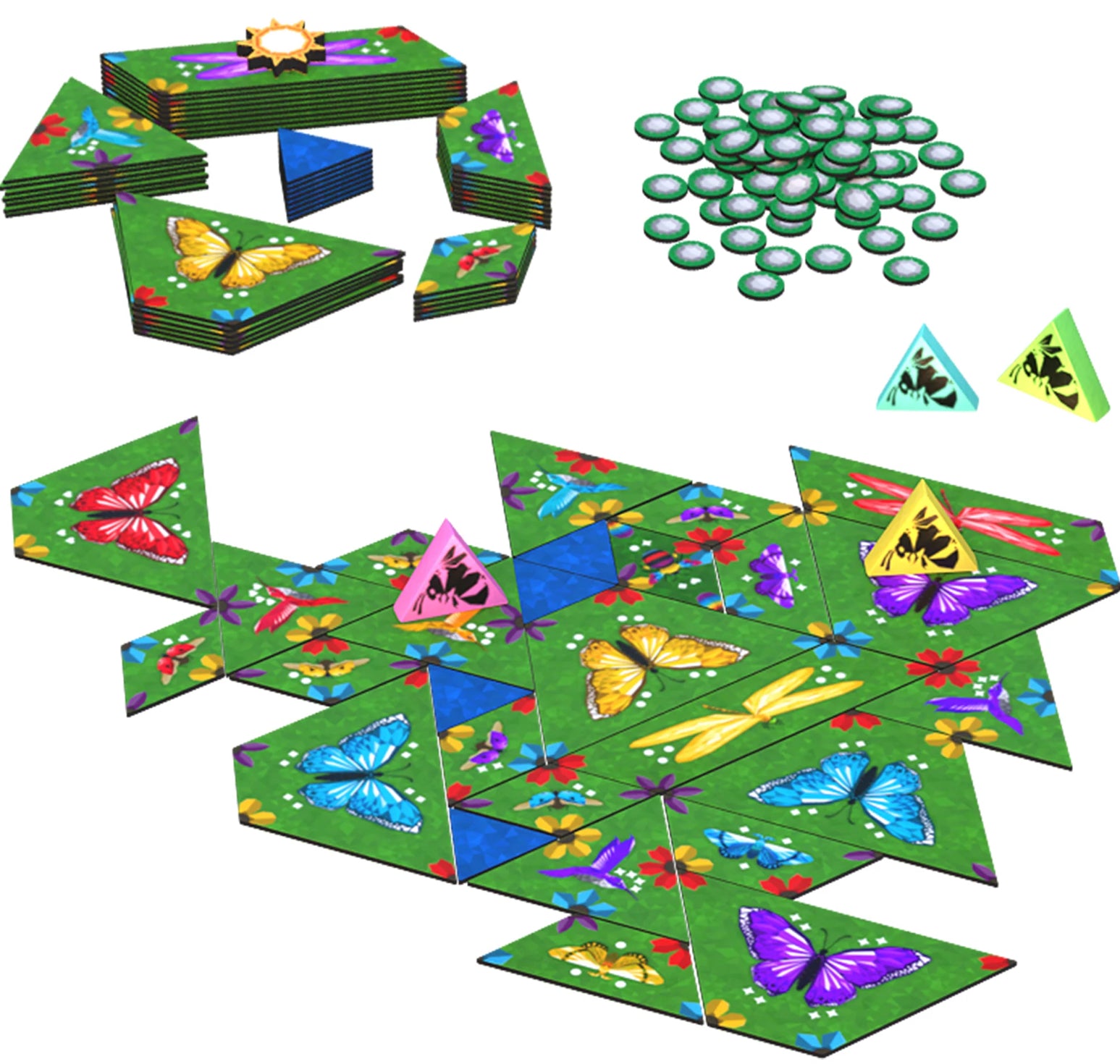 Flutter is a strategic tile-laying strategy game for 2 to 5 players, ages 8 and up, and it takes about 30 minutes to play. Players take turns laying tiles of varying shapes, earning petal tokens for matching flower petals in each corner. As the game progresses, players will spend those petal tokens when they enclose a previously laid tile, supplying the tile’s pollinator with all the flowers it needs, earning pollen. Once a single stack of tiles in the supply rondel has been emptied, the player with most pollen is the winner!