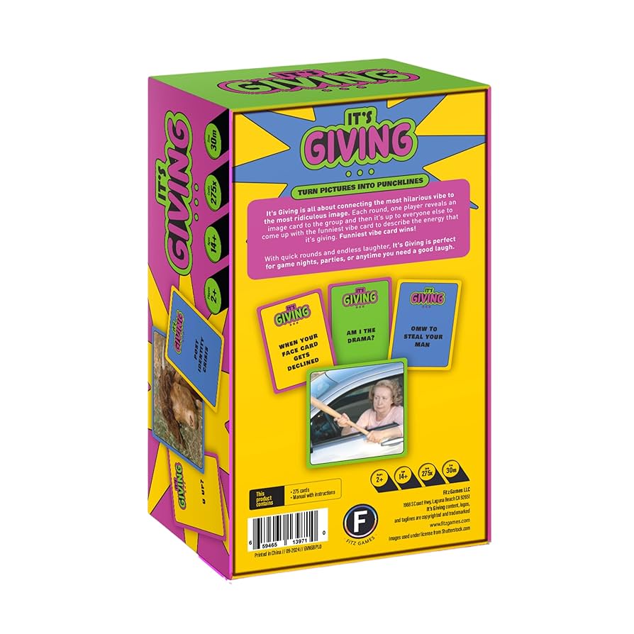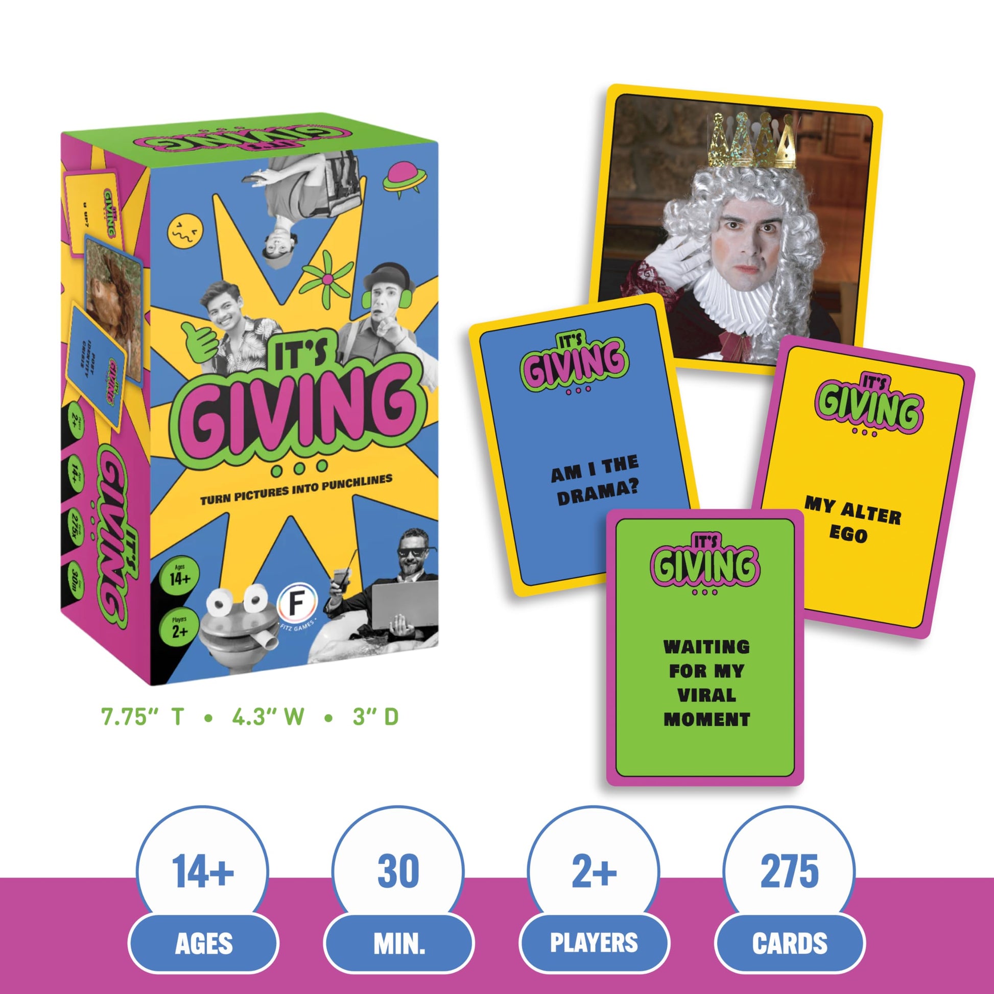 - HILARIOUS GAMEPLAY: "It's Giving" delivers endless laughter with its unique combination of image cards and witty "It's Giving" cards. Get ready for non-stop fun!