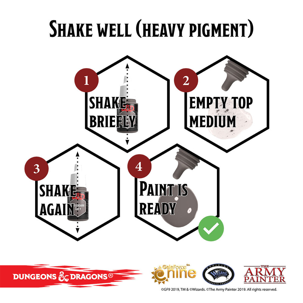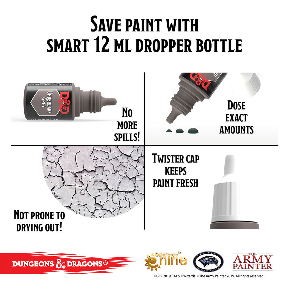 That's why this set includes exclusive D&D paints including 8 high-quality, pigment dense acrylic paints fit for this fighter-ranger. Inside you'll also find a glossy-slime effect paint and a rich, shiny metallic paint. Each paint is filled in a 12ml precision dropper bottle that is spill-proof and easy to use.