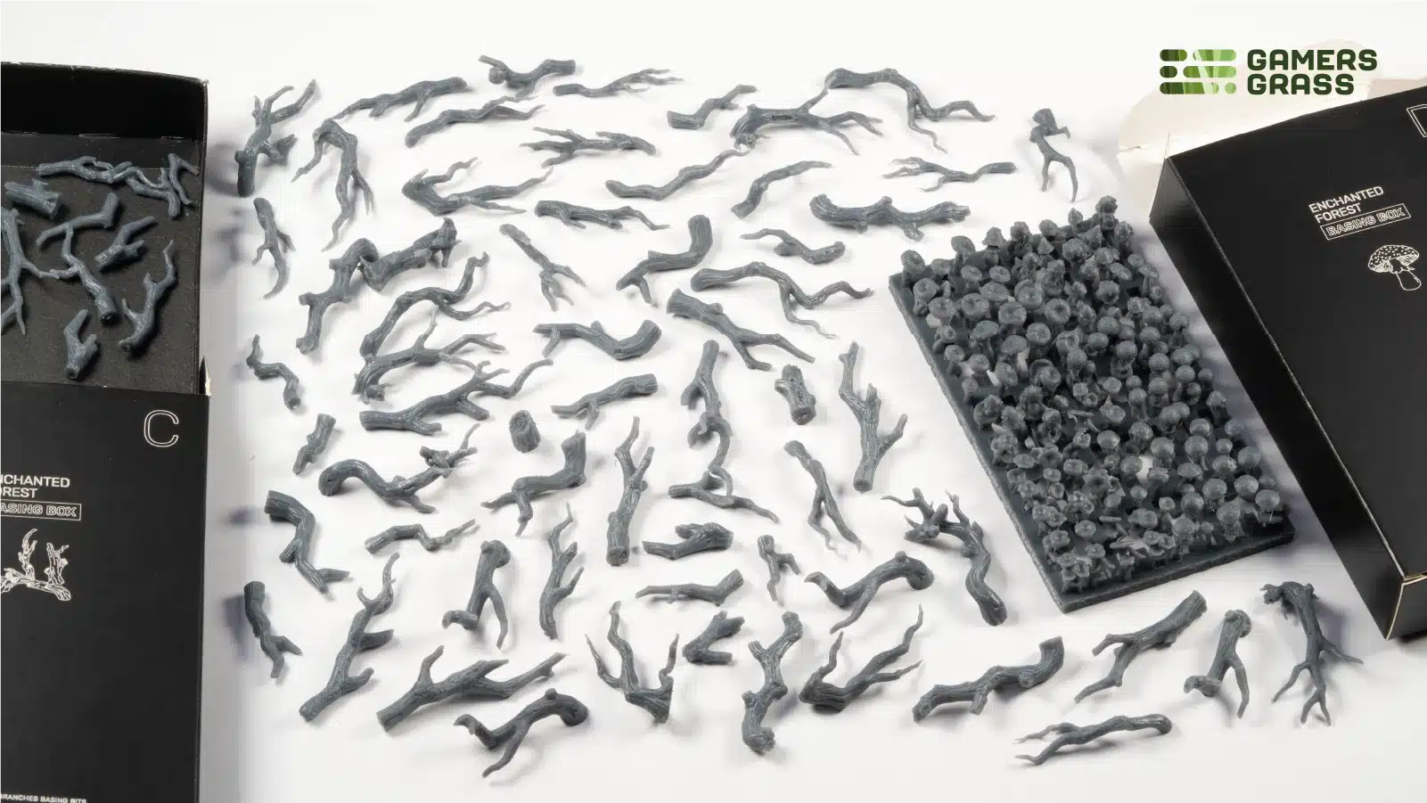 The Enchanted Forest Basing Box delves deep into a magical place, a lush forest where colorful mushrooms pop, intertwined with old roots, twigs, and logs. Amidst the dense woodland vegetation, a natural calmness is felt by many inconspicuous critters. That same essence is met by the ever-watchful gaze of the ravens – wise guardians of the site. For now, the wonders of this mysterious site lie hidden from many. Will your forces protect it?