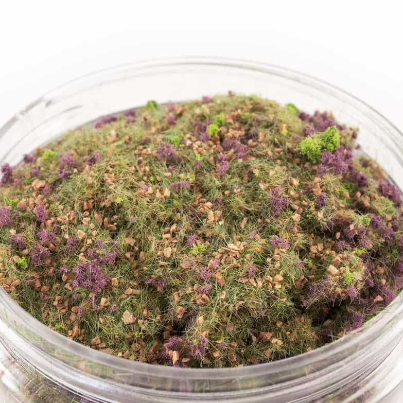 Huge Miniatures' 4-in-1 Moorland Scatter Flock is a blend of realistic static grass, foliage, and basing materials. This curated variety of basing material or terrain scatter is perfect for quickly and affordably creating a realistic landscape.