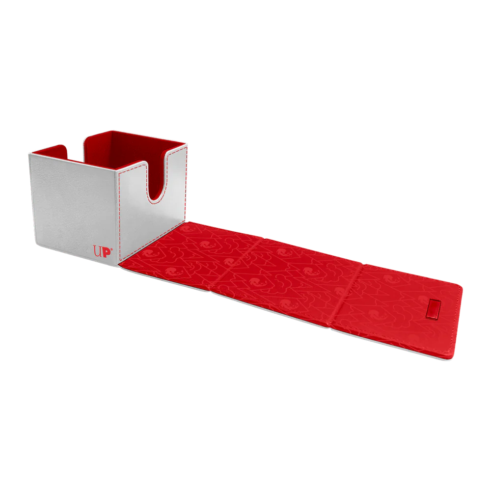 The Alcove Edge Deck Box® for Magic: The Gathering features the iconic Mana symbols debossed onto a leatherette finish, and has dual thumb notches for easy open access to your deck. Store and protect up to 100 standard size trading cards double-sleeved in Ultra PRO Deck Protector® sleeves. The interior features stylized artwork of the Mountain symbols on a red background. Strong magnetic closure with a locking mechanism keeps your cards securely stored when not in use.