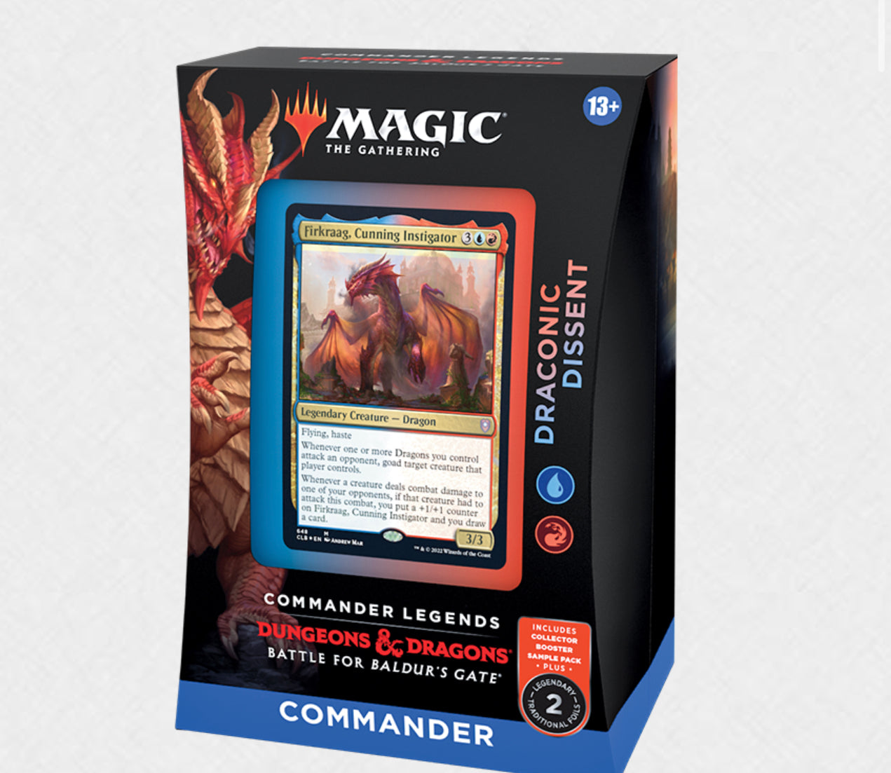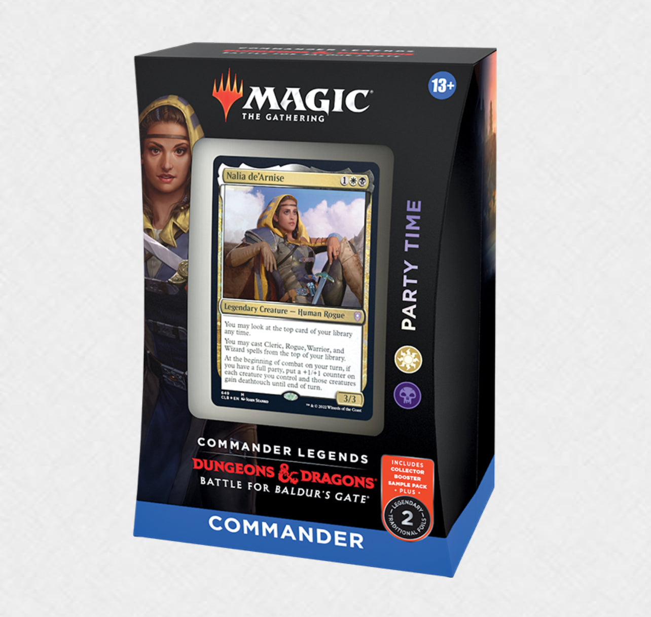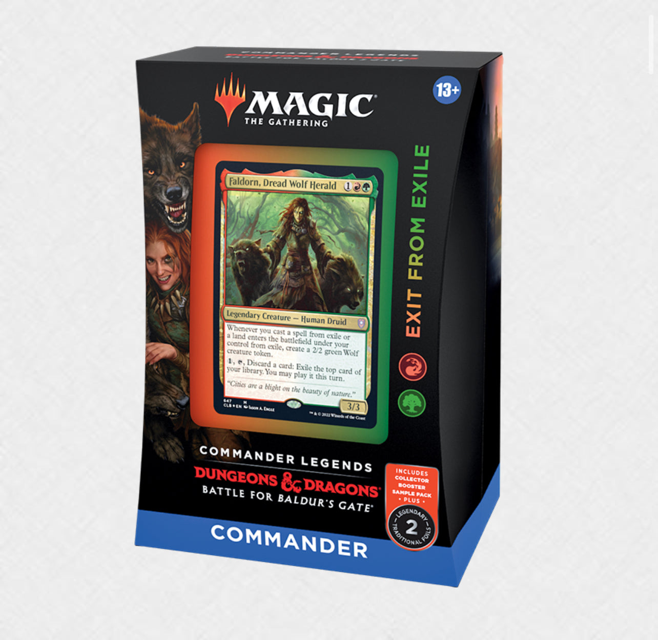 Commander Legends: Battle for Baldur's Gate introduces four new Commander decks. Each Commander deck includes a legendary "face" Commander as well as an alternate legend, plus a Background to use as Commanders. In total, each deck contains ten new-to-Magic cards.