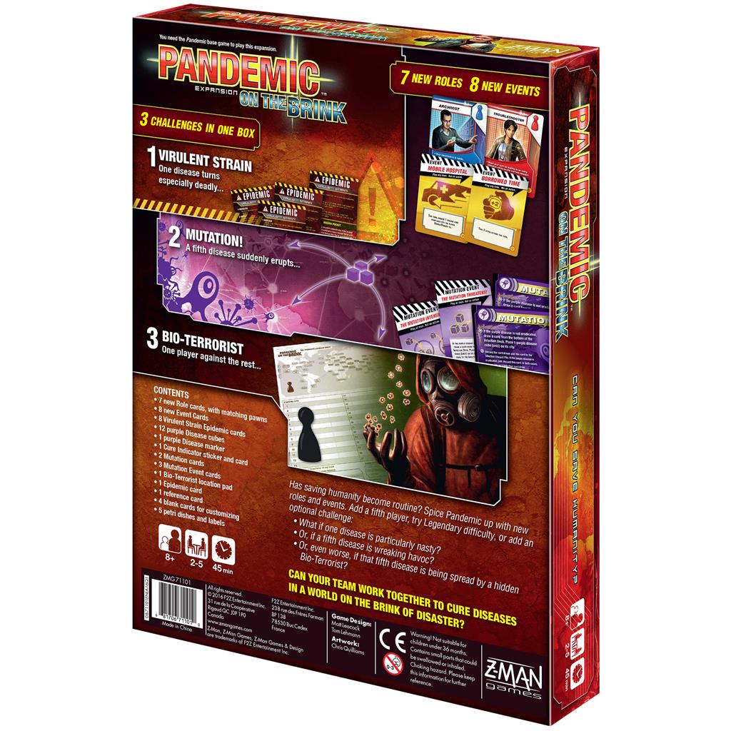 Raise the stakes and face new challenges with this Pandemic expansion. You've found the cures to four deadly diseases. But what happens when those diseases get stronger? Worse yet, what happens when someone spreads them intentionally?! Return to the world of Pandemic with On the Brink and prepare for the unexpected. The three challenges included with this expansion evolve the base game mechanics in exciting ways. One disease might become a Virulent Strain and become more difficult to treat as the game goes on. Or you could introduce an unpredictable fifth disease with the Mutation challenge and watch it pop up in unexpected places. Finally, teamwork is even more important if a fifth player dons the mask of the Bio-Terrorist and spreads panic while moving secretly across the board. Try each challenge individually or combine them all for a major test!