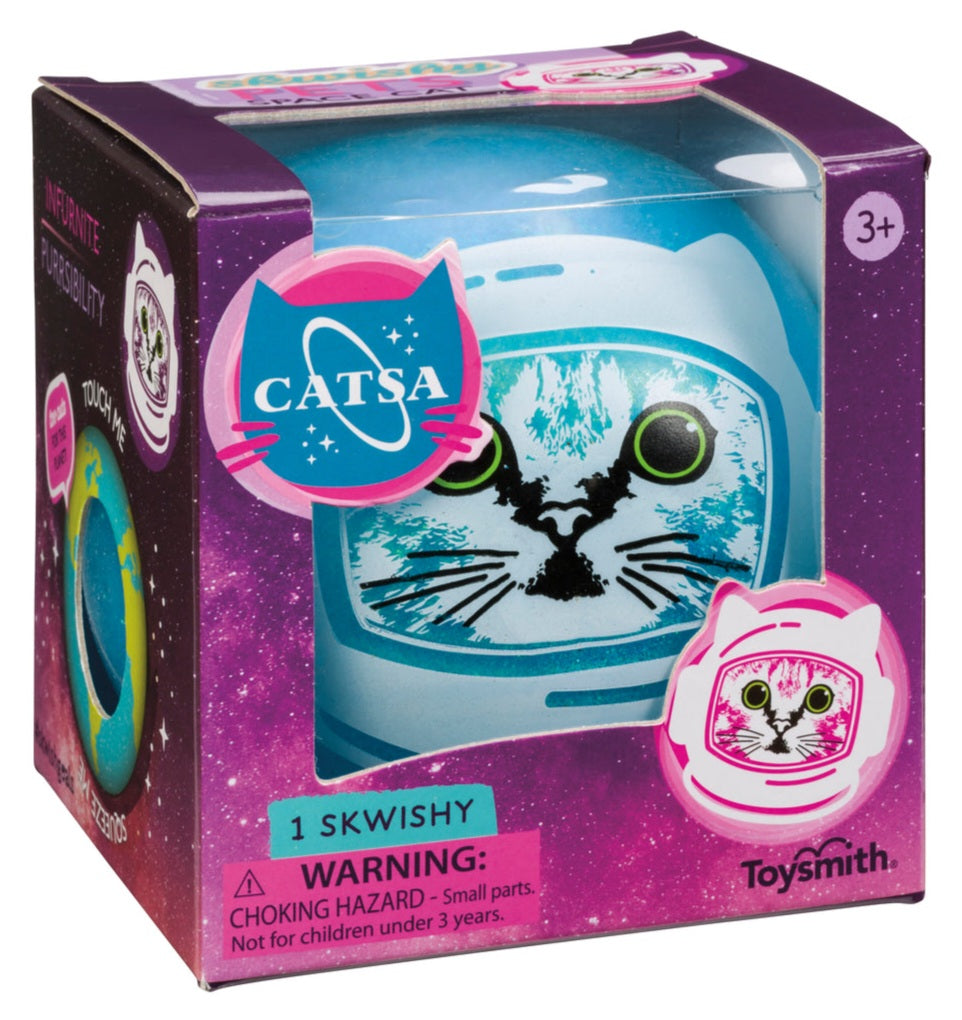 This toy ball comes in 2 bright colors and features an adorable cat astronaut with a realistic kitty face and big round lime-green eyes. Balls come in hot pink or bright blue and are slime filled and speckled with bright shiny glitter for a fun, sparkling cosmic effect. Soft and stretchy with cute visuals provide positive sensory stimulation, while the squishy design helps encourage calm and focus. A purple box contains 1 Skwishy Pets Space Cat toy.
