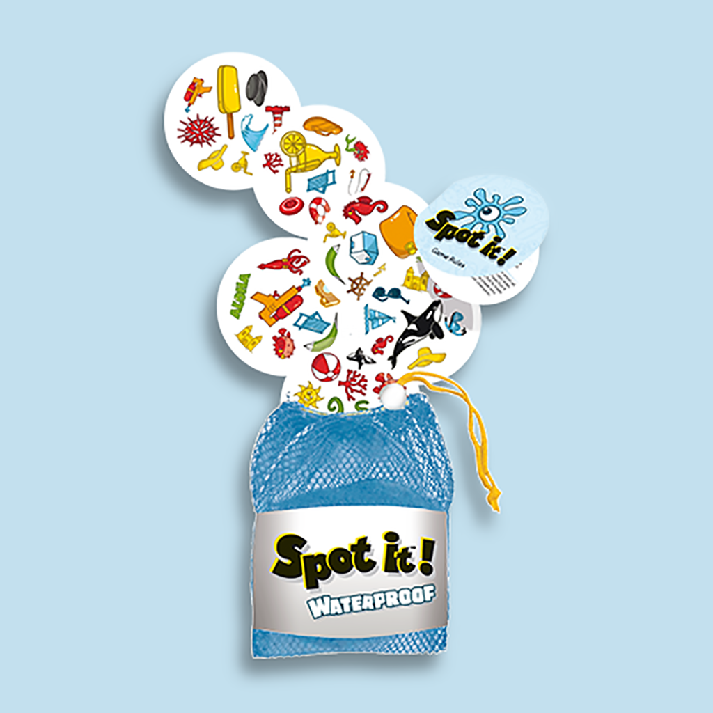 Make a splash with Spot It! Waterproof!Spot the match from card to card, all themed for the pool and beach. Complete with an easy to carry mesh bag & laminated cards, this version of Spot It! will surely be a hit at your next pool party or beach outing.With quick, engaging gameplay and multiple variants to play, Spot It! Waterproof is quick fun for the whole family.