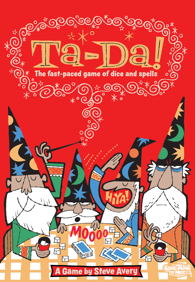 This year's annual Wizard Talent Show promises to be an exciting event with skilled witches and wizards attending from far and wide. Players will attempt to prove they are the most talented and deserving spell caster of the bunch.Ta-Da! is played over a number of fast-paced, frantic rounds. You will be furiously rolling dice in an effort to collect the elements needed to cast your spell. With each roll, you can add one die to your spell and must re-roll the rest. As soon as you have completed your spell you yell ‘Ta-da!' and you're one step closer to winning the Talent Show. However, game changing Feats will be in play throughout the game, making you perform crazy acts as you play, such as make animal noises, keeping your head on the table and more!