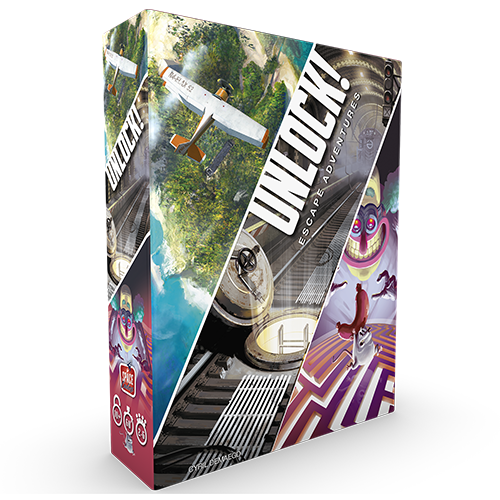 UNLOCK! is a series of escape adventures for up to six players. With one hour on the clock, players must work through a deck of sixty cards as a team, searching for clues, combining objects, and solving puzzles. The free UNLOCK! companion app runs the timer while providing clues, offering hints, and confirming successes. Once the team has reached a solution and entered the correct code into the app, they win the game!