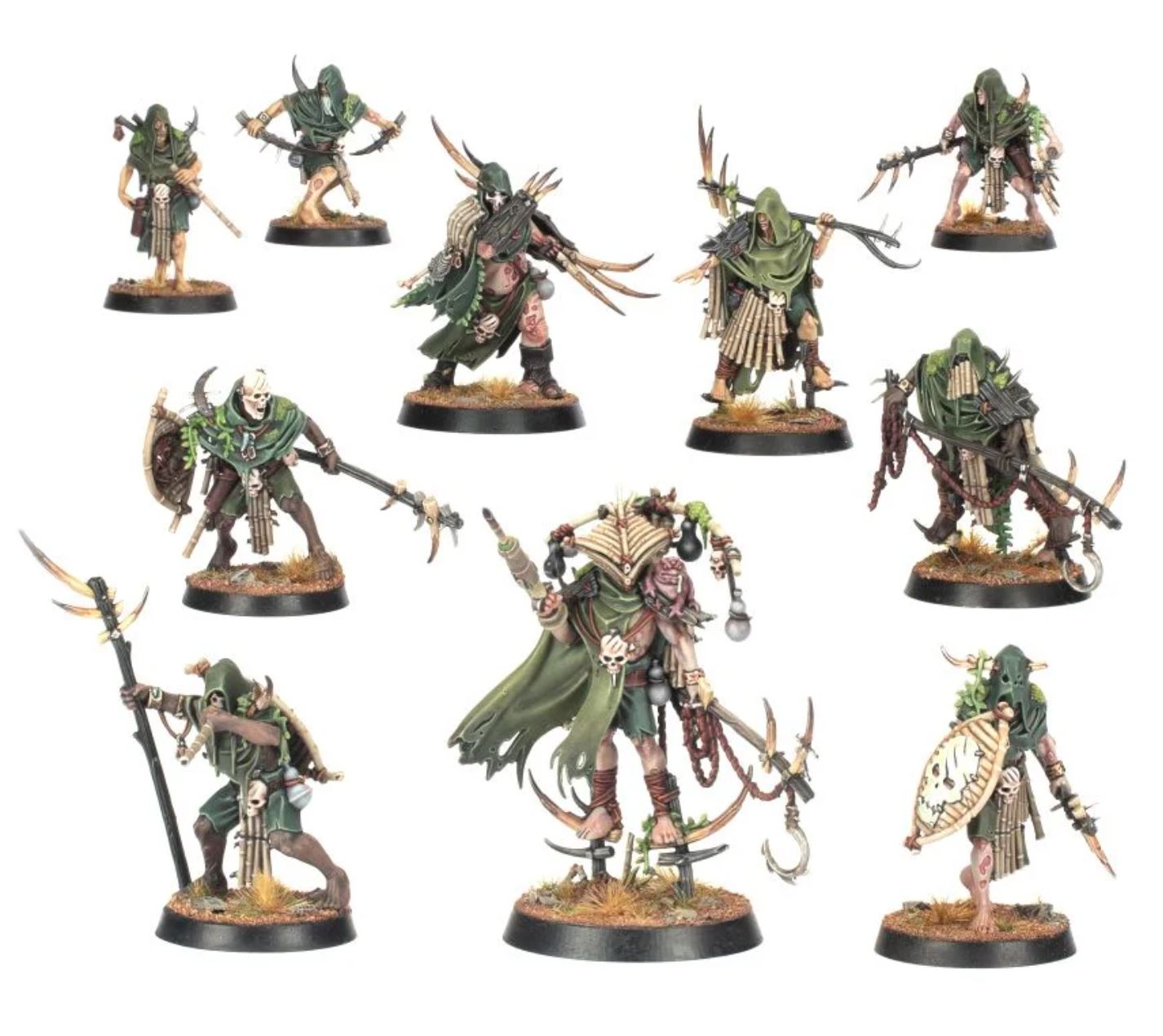 – Rotmire Creed – 10 foul swamp-dwellers eager to test their toxins. These multipart plastic miniatures include 1x Witherlord, 1x Bloated One, 2x Carrion Catchers, and 6x Mirefolk Outcasts with a variety of weapons