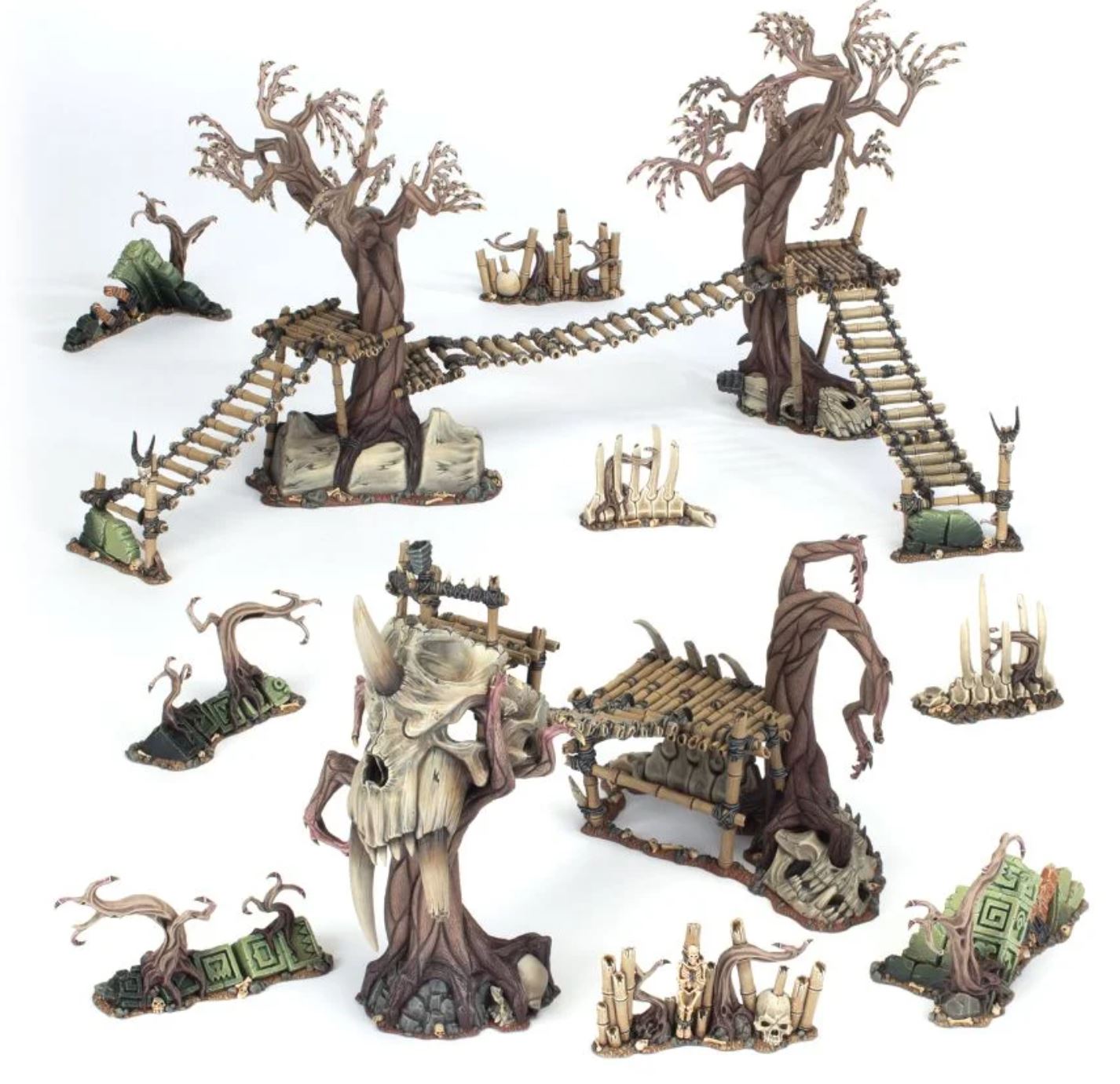 – Gnarlwood scenery – 18 plastic terrain pieces to build on your battlefield, including 1x Watchtower, 2x Gnarloaks, 4x Rope Bridges, 1x Rib Platform, and 10x Obstacles such as shattered ruins, palisades, bones, and broken posts